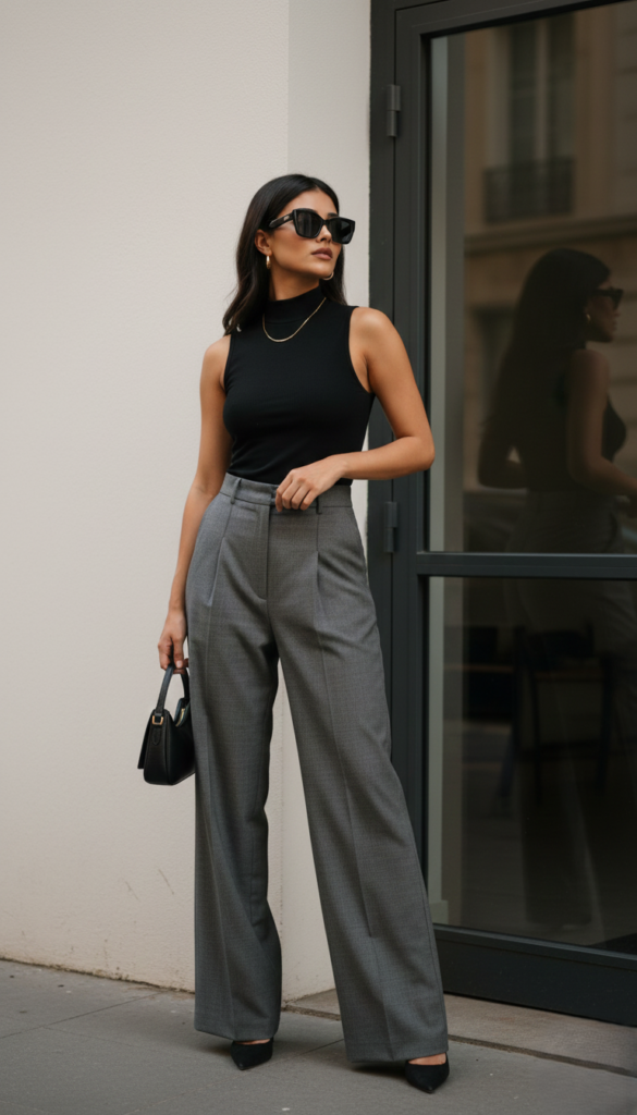 A fitted sleeveless black top paired with grey wide-leg trousers creates a minimalist yet elegant office outfit. This combination works well in warmer weather while still maintaining a professional appearance.