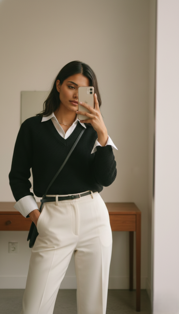 This outfit combines a black sweater layered over a white shirt with crisp white trousers. The contrast between black and white creates a timeless and elegant office style that always looks polished.