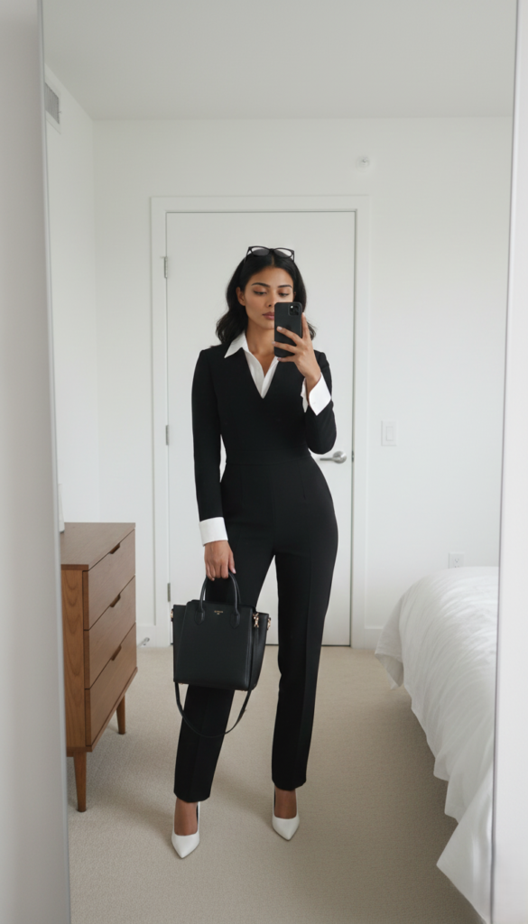 A tailored black jumpsuit layered over a crisp white shirt creates a powerful and sophisticated office outfit. This modern silhouette feels elegant and professional while offering a slightly different alternative to traditional suits.