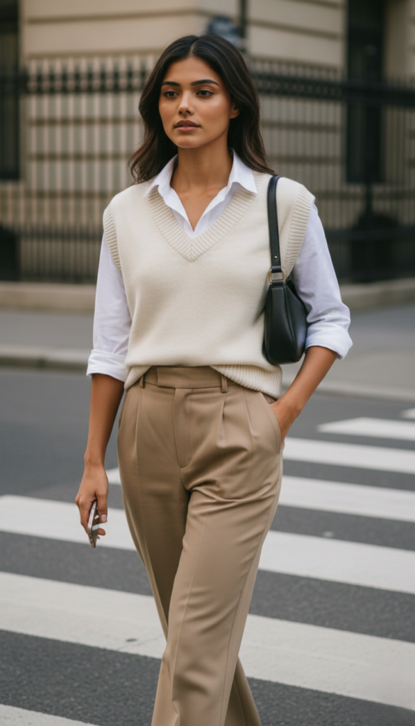 A white button-down shirt layered under a neutral sweater vest creates a classic preppy office outfit. Paired with tailored beige trousers, this look feels both comfortable and polished.