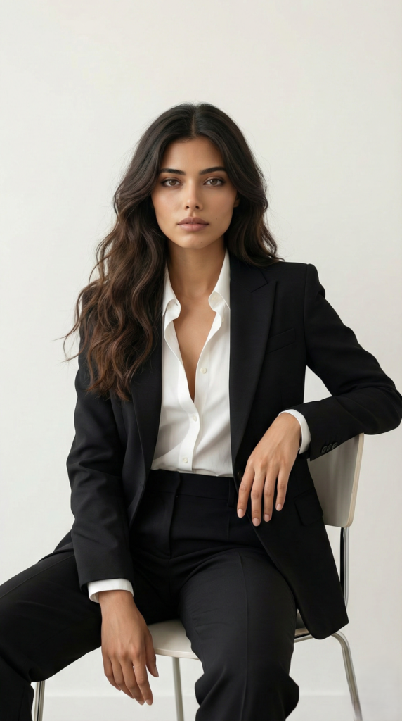 A black vest suit layered over a crisp white shirt creates a sleek and modern office outfit. The tailored silhouette gives the look a powerful and professional appearance.