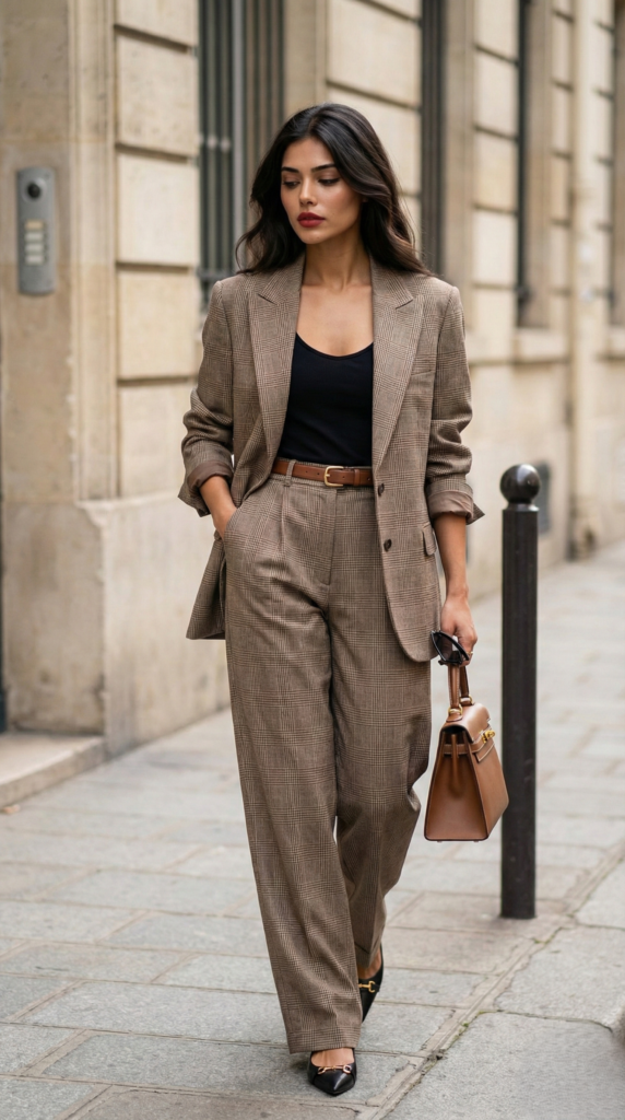 Plaid suits are an excellent way to introduce pattern into your office wardrobe while still maintaining professionalism. A structured plaid blazer paired with matching trousers creates a strong and stylish outfit suitable for both meetings and everyday office wear.