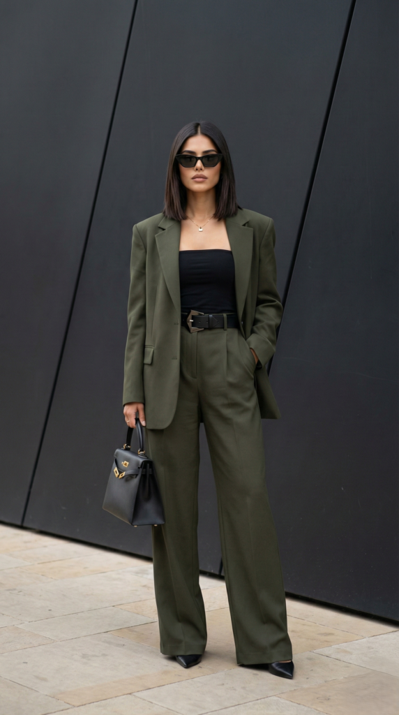A monochrome olive green suit instantly creates a bold and modern office outfit. The structured blazer combined with wide-leg trousers gives this look a confident and contemporary feel. Power suits like this are perfect when you want to make a strong professional impression.